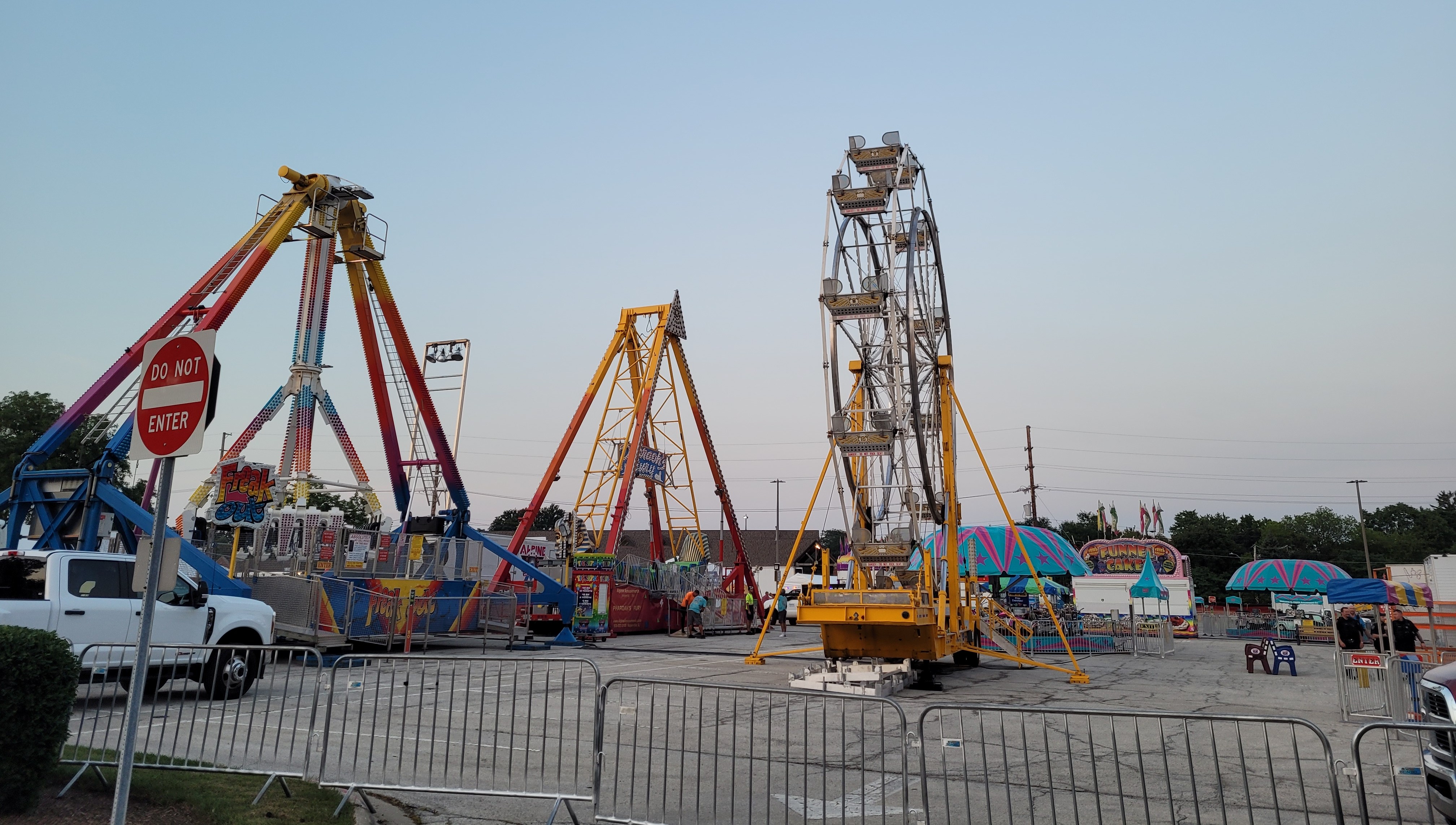 축제 장소는 바로 노스브룩 메트라(Metra) 기차역 서쪽 주차장이에요. 평소라면 출퇴근 시간에 차량들로 가득 차 있을 그 공간에 며칠 전부터 울타리가 쳐지고 커다란 놀이기구들이 하나둘씩 설치되기 시작하더라고요.